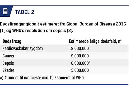 WHO’s estimat er, at der årligt dør 6 mio. mennesker af sepsis, og at mange af disse dødsfald er forebyggelige [2]. Erkendelsen er nu, at sepsis er det terminale syndrom for hovedparten af de infektionsrelaterede dødsfald, og at sepsis forårsager 10% af alle dødsfald globalt og kun overgås af kardiovaskulær sygdom og cancer (Tabel 2) [1]. Generelt er de publicerede sepsisincidensrater meget varierende, afhængigt af hvor og hvordan data er blevet indsamlet [7]. Geografi, lokalisation i sundhedsvæsenet og på hospitalerne samt anvendelsen af diagnosekoder eller journaldata influerer på estimaterne.