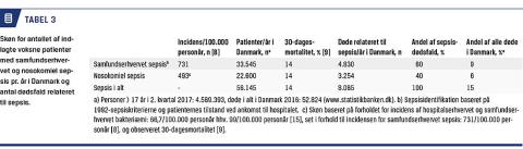 I Danmark er incidensen af sepsis ikke kendt, men data fra et populationsstudie fra Odense Universitetshospital indikerede meget høje incidensrater af samfundserhvervet sepsis (731/100.000 personår i risiko) baseret på symptomer og kliniske fund ved hospitalsindlæggelse [8]. Hvis der i stedet var blevet anvendt udskrivningsdiagnosekoder, ville incidensraten være syv gange lavere. Samlet havde patienter med sepsis en høj dødelighed på både kort og lang sigt [9], og derfor er det sandsynligt, at sepsis også bidrager betydeligt til dødelighed i Danmark. Dette understøttes af amerikanske data, der indikerer en meget stor samlet sepsisbyrde i USA. Således bidrog sepsis til hver andet eller tredje dødsfald i to store, uafhængige hospitalskohorter [10]. Mere end hver femte amerikanske patient, der har sepsis og udskrives i live, dør af tilstanden inden for to år [11]. Data fra den amerikanske genindlæggelsesdatabase indikerer, at 43% af de patienter, der havde sepsis og blev udskrevet i live, blev genindlagt inden for 90 dage [12]. Estimatet er tæt på de 30%, der blev observeret i et dansk væskeforsøg med patienter med svær sepsis på intensivafdelinger [13]. Et år efter inklusion i det danske forsøg var mere end 60% af patienterne blevet genindlagt, og samlet var 50% døde [13]. Overleverne havde desuden væsentligt dårligere fysisk og mental livskvalitet end matchede populationskontrolpersoner [14].