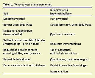Underernæring har fra gammel tid været relateret til flygtninge, misbrugere, anorektikere og småtspisende ældre på institutioner. Der er her tale om personer, som taber sig over lang tid pga. for ringe indtagelse af energi, og som derfor ender med et lavt body mass index (BMI). Metabolisk er disse personer karakteriseret ved, at der sker en adaptation til kroppens nye omstændigheder (Tabel 1 ). Tilstanden er af Keys særdeles godt undersøgt hos unge mænd under 2. verdenskrig med interventionsperioder på ca. seks måneder [1]. Der er næppe tvivl om, at disse personer har en større sygelighed end de ikkeunderernærede, men af gode grunde er randomiserede studier ikke mulige. Et af de mere kontante problemer ved sygdom i denne gruppe er risikoen for »refeeding -fænomener«, når de bliver indlagt, og der optræder et ønske om at rette op på ernæringstilstanden på meget kort tid. Man har så problemer med de yderst beskedne depoter af mange koenzymer mv., som adaptationen har medført.