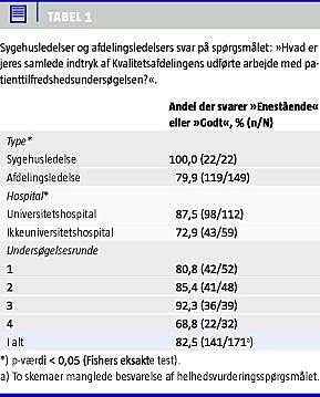 Lægernes forhold til patienttilfredshedsmålinger er beskrevet i en anden evaluering af Århus-konceptet [18]. Her var svarpersonerne læger udenfor kredsen af ledende overlæger. I den evaluering konkluderede man, at lægerne som højt professionaliseret gruppe ikke har ladet sig »kolonisere« af konceptet, men at de nærmest har »dekoblet" sig. Set på den baggrund ville de resultater, der præsenteres i denne artikel, formodentlig have været væsentligt mere kritiske, såfremt læger under ledende overlæge var blevet spurgt.