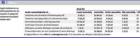 Tabel 3 viser afdelingsledelsernes og sygehusledelsernes vurdering af de forskellige dele af konceptet. De to spørgsmål, hvor flest scorede »Meget anvendelig«, var vedrørende indsamlingen af kommentarer fra patienterne, og at svarene var opdelt på afsnit og diagnoser. De spørgsmål, der fik de dårligste scorer, vedrørte sammenligning med andre afdelinger.