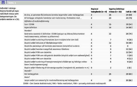 Efter skriftlig henvendelse til regionerne blev retningslinjer for medicinafstemning for regionen og/eller regionens sygehuse fremsendt pr. mail eller med link til regionens dokumentstyringssystem. Fokus i denne undersøgelse er afgrænset til akutte indlæggelser og indlæggelsessituationen. Retningslinjer (eller dele af), der var relateret til akutte indlæggelser, blev inkluderet. Retningslinjer, der alene omhandlede elektive indlæggelser eller interne overflytninger, herunder til intensivafdelinger, blev ikke inkluderet. Efter gennemlæsning af retningslinjerne blev disse kategoriseret efter formål, og efter hvordan, hvornår og hvem der foretog og dokumenterede medicinafstemning ved indlæggelsen. Resultaterne blev bearbejdet i EpiData.