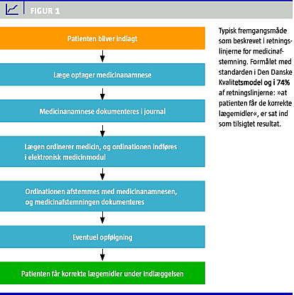 Medicineringsfejl er et væsentligt problem i sundhedsvæsenet. Således udgør medicineringshændelser ca. en tredjedel af de knap 35.000 rapporterede utilsigtede hændelser på nationalt niveau, og 1-2% af disse er alvorlige [1]. Medicinafstemning blev inkluderet som standard i Den Danske Kvalitetsmodel i 2009 for »at sikre, at patienten får de korrekte lægemidler ved indlæggelse ...« og »at forebygge utilsigtede hændelser ved medicinering ved overflytninger mellem forskellige enheder/institutioner samt ved udskrivelse fra institutionen til opfølgning andetsteds«. Medicinafstemning blev inkluderet, selvom det i Operation Life var et af de områder, der havde svag evidens [2] og viste sig at være vanskelig at implementere [3]. Joint Commission valgte efter en amerikansk konsensuskonference i 2009 at lade medicinafstemning udgå af akkrediteringsgrundlaget i erkendelse af uklarhed om definitioner og vanskeligheder med implementering på en systematisk måde. Fra samme konference blev der foreslået en mere trinvis udrulning af medicinafstemning og mere forskning på området [4]. Formålet med denne undersøgelse er at beskrive, hvorledes man forestiller sig at gennemføre medicinafstemning på danske sygehuse i henhold til standarden i Den Danske Kvalitetsmodel. Undersøgelsen er en del af en større undersøgelse af medicinafstemning ved akutte indlæggelser [5].