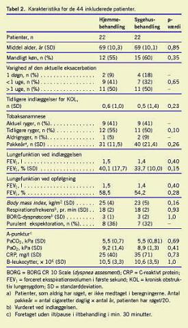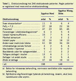 Kun 44 patienter (12%) af de 390 registrerede patienter kunne inkluderes i undersøgelsen. I udenlandske undersøgelser [4-6] har henholdsvis 17%, 18% og 26% af patienterne kunnet inkluderes. Det lavere antal patienter i vores studie kan ikke forklares ud fra forskel i kliniske data, sværhedsgrad i lungesygdom eller ved forskel i sværhedsgrad af eksacerbationen, men ved at flere patienter i vores undersøgelse (20%) afslog at deltage eller tidligere havde deltaget i undersøgelsen. Årsagen til, at flere patienter afslog at deltage, var i flere tilfælde, at de ikke allerede inden for 1-2 døgn følte sig i stand til udskrivelse. I de udenlandske undersøgelser var den gennemsnitlige indlæggelsestid inden udskrivelse til hjemmebehandling tre døgn, mens den i vores undersøgelse var 1,3 døgn.