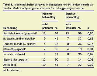 Den medicinske behandling fremgår af Tabel 3 . Systemisk steroidbehandling var for alle patienter påbegyndt af egen læge/vagtlæge kort forud for indlæggelsen. Andelen af patienter i systemisk steroidbehandling i sygehusbehandlingsgruppen steg til ti patienter (45%) ved udskrivelsen, mens 19 patienter (86%) i hjemmebehandling fortsat var i systemisk steroidbehandling ved afslutningen af hjemmebehandlingen.