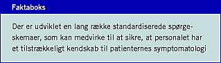 Der er publiceret flere hundrede spørgeskemaer, der anvendes til at beskrive symptomer, men mange af disse er ikke egnede til kræftpatienter, der modtager palliativ indsats [2]. Mange har ikke det rette indhold, er for lange eller passer af andre grunde ikke til målgruppen. Ved udvælgelsen af et spørgeskema er det desuden væsentligt at vurdere, om spørgeskemaet er videnskabeligt afprøvet via belysning af relevante aspekter af validitet og reliabilitet. Sådanne undersøgelser omfatter dels nogle ret enkle (men afgørende) problemstillinger, såsom hvorvidt spørgeskemaets resultater giver et korrekt indtryk af patientens situation, dels mere komplicerede statistiske analyser. Det er ikke usædvanligt, at udvikling og validering af et spørgeskema tager 5-10 år eller mere.