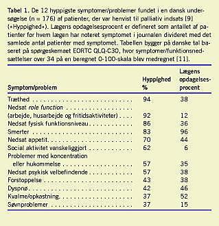 I Tabel 1 vises udvalgte resultater fra en undersøgelse af patienter, der var henvist til palliativ indsats på Palliativ Medicinsk Afdeling, Bispebjerg Hospital. Ud af 278 konsekutive patienter var 267 dansktalende og mindst 18 år. Af disse udfyldte 176 (66%) spørgeskemaet helt eller delvis. Dette viste således, at rutinemæssig anvendelse af spørgeskemaer er gennemførlig. I tabellen vises de 12 hyppigste symptomer og problemer, der blev målt med spørgeskemaet EORTC QLQ-C30. Til sammenligning kan nævnes en nylig publiceret amerikansk undersøgelse [8]. Det amerikanske studium omfattede i alt 48 symptomer, men man vurderede ikke funktionstab. Den relative hyppigh ed i de to studier var nogenlunde den samme. De hyppigste symptomer, der ikke indgik i den danske undersøgelse, var mundtørhed (67%), vægttab (54%), tidlig mæthedsfølelse (49%) og hoste (39%).