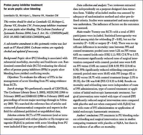 <li>Leontiadis GI, McIntyre L, Sharma VK et al. Proton pump inhibitor treatment for acute peptic ulcer bleeding. The Cochrane Database of Systematic Reviews 2004, Issue 3. Art. No.: CD002094.pub2. DOI: 10.1002/14651858.</li>