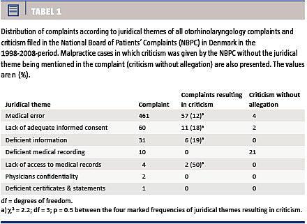 I 21 sager blev der udtalt kritik af mangelfuld journalføring på trods af, at der ikke var klaget herover. Mangelfuld eller forkert behandling var det juridiske tema, som var hyppigst i klagerne, men som mest sjældent medførte kritik sammenlignet med de andre seks juridiske temaer. Glemte tamponer efter operation, forveksling af operationssiden og forbrændings- og ætsningsskader var nogle af de behandlinger, som var behæftet med en høj kritikrate. Derimod medførte hændelige kirurgiske komplikationer som nerveskade, blødning og infektion typisk ikke kritik. Den anatomiske fordeling af ØNH-sygdomme nævnt i klagerne viste en overrepræsentation af sygdomme inden for audiologi og øresygdomme. I 3,5% af tilfældene angik klagerne dødelig udgang efter ØNH-behandling. Den numerisk oftest indklagede ØNH-operation i denne undersøgelse var tonsillektomi, som er den næsthyppigste ØNH-operation i Danmark (ca. 6.000 operationer/år). Klager over tonsillektomi medførte kritik hos 20%. Postoperative komplikationer som blødning, smerter og ganesejlsinsufficiens var årsager til klagerne efter tonsillektomi.