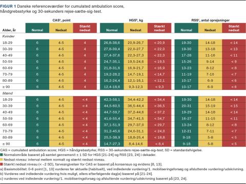 For hver test er der udarbejdet detaljerede testmanualer og instruktionsvideoer [30] og danske dekadereferenceværdier for normalt (grønt), nedsat (gult) og stærkt nedsat (rødt) niveau for voksne mænd og kvinder (Figur 1). Farveangivelser for CAS-værdier er baseret på konsensus og evidens [8, 13], mens farveangivelser for HGS [21-24] og RSS [23, 24] er udregnet på baggrund af værdier i respektive studier som samlet gennemsnit ± 1 standardafvigelse (SD) for grøn farve, interval mellem grøn og rød for gul farve og < –2 SD for rød farve. Disse værdier kan indarbejdes i elektroniske patientjournaler, så den enkelte patients niveau svarende til aldersdekade og køn automatisk synliggøres ved indtastning af værdi.