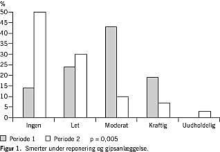 Der var ikke nogen signifikant forskel på patienternes angivelse af smerteoplevelse fra ankomst til skadestuen og indtil reponering af frakturen. Således var der i den første serie fire ud af 21 patienter, der angav ingen eller kun milde smerter i dette tidsrum (19%), og i serie 2 var denne andel ti ud af 30 patienter (33%) (p = 0,38 Mann-Whitneys test). Derimod var der højsignifikant forskel i smerteoplevelse under selve repositionen og den efterfølgende anlæggelse af gips. Her så vi, at der i den første serie kun var otte ud af 21 patienter (38%), der angav ikke at have oplevet smerter eller kun milde smerter i forbindelse med selve behandlingen. I den anden serie var denne andel øget til 24 ud af 30 patienter (80%) (Figur 1 ) (p = 0,005 Mann-Whitneys test).