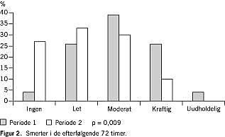 Smerter i de efterfølgende 72 timer var også signifikant reduceret. Kun syv ud af 23 patienter (30%) i den første serie angav ingen eller kun milde smerter, hvorimod denne andel var øget til 18 ud af 30 (60%) i anden serie (Figur 2 ) (p = 0,009 Mann-Whitneys test).