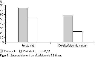 Der var færre søvnproblemer i serie 2 end i serie 1. I de første 24 timer i første serie var der 17 (74%) ud af 23 patienter, der angav søvnproblemer. I den anden serie var dette reduceret til 15 ud af 30 patienter. Forskellen var dog ikke signifikant (p = 0,14 Fishers eksakte test). Det var derimod tilfældet i de efterfølgende 48 timer, hvor 13 (57%) ud af 23 patienter i serie 1 klagede over søvnproblemer. Kun 7 (23%) ud af 30 patienter havde lignende klager i serie 2 (p = 0,04 Fischers eksakte test) (Figur 3 ).