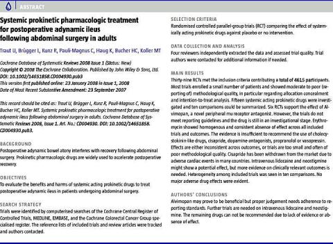 Based on the evidence presented in the Cochrane review "Systemic prokinetic pharmacologic treatment for postoperative adynamic ileus following abdominal surgery in adults", routine administration of systemic prokin etics for the prevention of postoperative ileus is not recommendable. The potential of selective opioid antagonists and intravenous lidocaine should be further investigated, particularly in conjunction with laparoscopic surgery, epidural pain management and fast-track surgery.