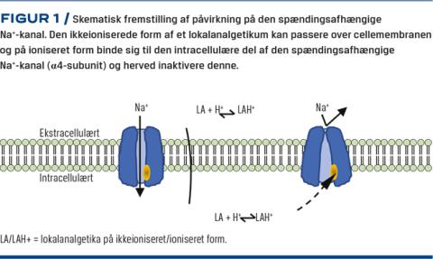 LA virker intracellulært ved en reversibel hæmning af den spændingsafhængige Na+-kanal, hvilket forhindrer aktionspotentialers udbredelse (Figur 1). I den kliniske hverdag bruges denne effekt primært til at blokere nerveledningen i smertefibre, men alle celler med spændingsafhængige natriumkanaler kan påvirkes [4].
