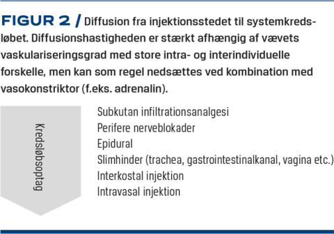 Risikoen for forgiftning er ud over dosis afhængig af faktorer, der påvirker den systemiske LA-koncentration, herunder hastighed af indgift, proteinbinding, fedtopløselighed, ionisering samt injektionsstedet og lægemidlets diffusion herfra (Figur 2). Disse faktorer vanskeliggør prædiktionen af, hvor stor en dosis, der vil kunne udløse forgiftningssymptomer hos det enkelte individ [7, 9]. Yderligere skal man ved kombination af forskellige LA forvente en additiv virkning på den toksiske effekt. De anbefalede maksimaldoser i litteraturen er ikke entydige og bør kun være vejledende (f.eks. bupivacain 2-4 mg/kg, lidocain 4-7 mg/kg eller ropivacain 2-4 mg/kg) [7, 9, 13]. Patienttype, applikationssted, brug af vasokonstriktor og andre faktorer, der påvirker redistributionshastigheden, skal altid medregnes. Risikopatienter er ældre, neonatale, gravide og underernærede patienter samt patienter med hjertesvigt og/eller leversygdom. De typiske risikoscenarier inkluderer stor dosis (høj enkeltdosis, høj infusionshastighed, høj kumuleret dosis ved multiple doser f.eks. hvor både anæstesipersonale og kirurg administrerer lokalanalgetika), bedøvelse i svælg (spray), accidentielle intravaskulære injektioner, specielt i hoved-hals-regionen, hvor der hurtigt opnås høje koncentrationer i CNS, blinde/anatomisk landemærke-teknikker, f.eks. anlæggelse af pleuradræn og femoralis- eller pudendusblok.