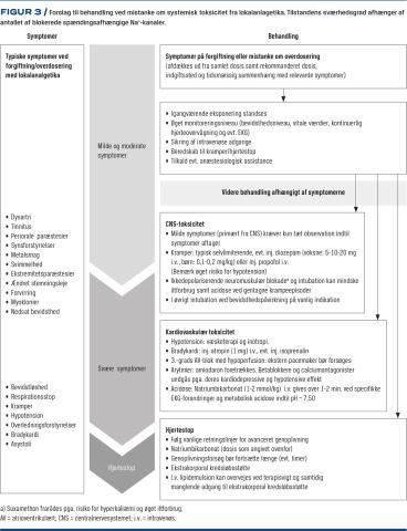 Kramper forårsaget af LA er oftest selvlimiterende, formentligt pga. hurtig redistribution. Da både respiratorisk og metabolisk acidose øger risikoen for CNS-toksicitet [14], bør kramper behandles hurtigt, hvorved cirkulatorisk kollaps og hjertestop muligvis kan undgås [7]. Førstevalg til behandlingen af kramperne er benzodiazepiner [2, 7]. Yderligere bør eventuel ledsagende hypoksi, hyperkapni, acidose og hyperkaliæmi korrigeres, da disse tilstande kan forværre de toksiske effekter, og tidlig behandling vil derfor ofte inkludere støttende/kontrolleret ventilation [14]. Natriumbikarbonat kan anvendes til behandling af kardielle symptomer, særligt hvis blokade af den kardielle spændingsafhængige Na+-kanal er understøttet af ekg-forandringer, hvor typisk breddeøgede QRS-komplekser ses. Den gavnlige effekt tilskrives primært en stigning i systemisk pH og i mindre grad en øgning af den ekstracellulære natriumkoncentration [15, 16]. Behandling med natriumbikarbonat kræver regelmæssig kontrol af pH og elektrolytniveau samt øget ventilation. Uddybende behandlingforslag er præsenteret i Figur 3 [8, 9, 17, 18].