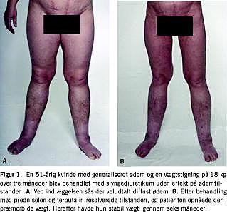En 51-årig kvinde, der havde haft type 1-diabetes fra syvårs-alderen, blev indlagt med en uforklaret vægtstigning på 18 kg over en periode på tre måneder ledsaget af generaliseret ødem. Der var diabetesrelaterede komplikationer i form af mikrovaskulære manifestationer (retinopati grad 1, ingen nefropati); desuden var der makrovaskulære komplikationer i form af apoplektisk insult med yderst beskedne sequelae. Herudover havde patienten velbehandlet Graves sygdom, og en klinisk undersøgelse viste generaliseret ødem (Figur 1 ). Blodtrykket var 120-130/60-80, hvilket var hendes habituelle niveau. Hun blev udredt for nyre-lever-sygdom, malign lidel-se, kardial sygdom og anden systemsygdom. Det primære undersøgelsesprogram omfattede følgende billeddiagnostiske undersøgelser: computertomografi af thorax og abdomen, ultralydundersøgelse af abdomen og ekkokardiografi. Man fandt bilateral pleuraeksudat. Ved en biopsi fra en enkelt palpabel halsglandel fandt man reaktive forandringer uden malignitetssuspicio. Serologiske markører for et panel af vira (cytomegalovirus, Epstein-Barr-virus, Parvovirus B19 og hiv), tumormarkører samt screening for antinukleære antistoffer og antineutrofile cytoplasmatiske antistoffer gav alle upåfaldende resultater. Ved en endokrinologisk udredning fandt man normal hypofyse-, thyroidea- og binyrefunktion. S-albumin var reduceret til 29 g pr. l (ref. 37-48 g pr. l) og dU-natrium var meget lav (< 20 mmol). M-komponent i serum var positiv (type immunglobulin G (IgG)-kappa), men totalimmunglobulinkoncentrationen var normal. M-komponent i serum normaliseredes efter behandling. Serum C1-esterase-inhibitoraktiviteten var let eleveret. Hæmoglobinniveauet var initialt 8,5 mM og faldt til 6,6 mM (ref. 7,0-10,0 mM) efter påbegyndelse af behandling. Undersøgelser af perifert blod og knoglemarv viste T-lymfocytose, og ved en flowcytometrisk undersøgelse fandt man en CD4/CD8-ratio på 21/54. Denne ratio normaliseredes under behandlingen til 21/26.