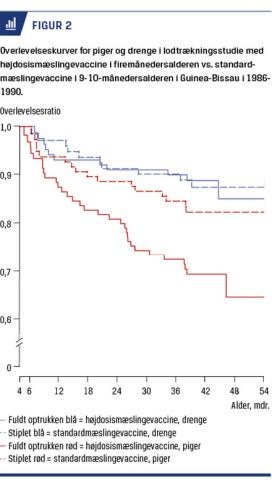Det førte til, at MV blev BHP’s fokusområde. Blandt andet testede vi i flere lodtrækningsstudier i Guinea-Bissau og Senegal, om vi kunne sænke dødeligheden yderligere med en ny højdosis-MV (HDMV), der kunne gives i 4-5-månedersalderen, tidligere end den normale MV [7]. Det modsatte skete: HDMV var forbundet med højere dødelighed. Selv om HDMV beskyttede mod mæslinger, havde børn, der havde fået HDMV i firemånedersalderen, højere dødelighed i de næste 4-5 år end børn, som havde fået almindelige MV i 9-10-månedersalderen. Men mest overraskende var det, at den negative effekt af HDMV kun blev fundet hos piger [8]. Effekten var den samme i Guinea-Bissau (Figur 2) og Senegal. I 1989, mens disse studier pågik, anbefalede WHO at give HDMV til alle børn i lavindkomstlande.