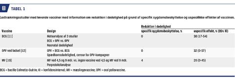 Disse studier har ført til flere konsistente mønstre. De fire levende vacciner, som vi har undersøgt, har alle gavnlige uspecifikke effekter. Vores lodtrækningsstudier med MV, bacille Calmette-Guérin (BCG) og oral poliovaccine (OPV) har vist, at reduktionen i dødelighed pga. de uspecifikke effekter er langt vigtigere end reduktionen pga. beskyttelse mod målsygdommen [10-12] (Tabel 1).