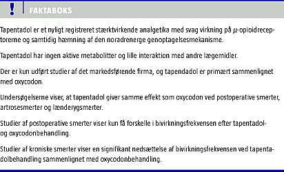 Summary Tapentadol is a new, strongly efficative analgeticum with dual effect mechanisms Ugeskr Læger 2011;173(25):1796-1799 Tapentadol exerts its analgesic effects through -opioid receptor agonism and noradrenaline reuptake inhibition in the central nervous system. Clinical studies show that tapentadol effectively relieves moderate to severe pain in both post-operative and chronic pain. In these trials with equianalgesic doses of tapentadol and oxycodone, treatment with tapentadol was associated with significantly fewer gastrointestinal-related adverse events. Furthermore, in a placebo-controlled study, tapentadol has shown good efficacy in painful diabetic polyneuropathy.