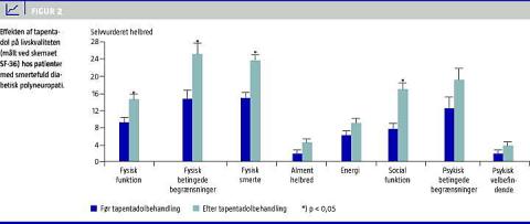 I et placebokontrolleret studie blev patienter med smertefuld diabetisk polyneuropati behandlet i 15 uger med TAP i depotformulering (200-500 mg/døgn). 62% af patienterne responderede på behandlingen, og disse patienter fik en gennemsnitlig smertelindring på ca. 30% [17]. I dette studie blev livskvaliteten målt med SF-36, et spørgeskema, hvormed man måler personers generelle selvvurderede helbred i otte forskellige dimensioner. Efter TAP-behandling fandt man forbedringer i flere dimensioner (Figur 2 ). Bivirkningsfrekvensen var som i de foregående studier.