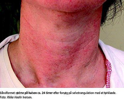 Resultater: Hos 43% var strangulation den primære henvisningsårsag, efterfulgt af kvælertag (29%), fald (14%) og slag (14%). Dysfagi var det hyppigste subjektive fund (55%), 17% var hæse og 5% havde stridor. Ved direkte fiberlaryngoskopi havde 33% endolaryngeal patologi (ødem og/eller sugillation). Tyve (15%) modtog behandling, heraf var 20% børn, 110 (85%) blev observeret. Akut intubation blev foretaget hos 2,3%. Moderate forsøg på selvstrangulation udgjorde den største andel af observationsgruppen (p = 0,01), fald og slag var hyppigere i behandlingsgruppen (p = 0,03). Dyspnø (< 0,001), hæshed (p = 0,007), stridor (p = 0,001) og endolaryngeal patologi (p < 0,001) var hyppigst i behandlingsgruppen.
