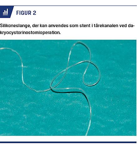 Ved en endonasal inspektion under END-DCR i 2014 blev der konstateret og fjernet et fremmedlegeme i den distale del af ductus nasolacrimalis i form af en ca. 4 cm lang silikoneslange (Figur 2). Silikoneslangen var synlig under concha inferior ved Hasners membran. Herefter blev der etableret anastomose fra cavum nasi til saccus lacrimalis ved at afbore processus frontalis på os maxillae med efterfølgende anlæggelse af en silikonestent.