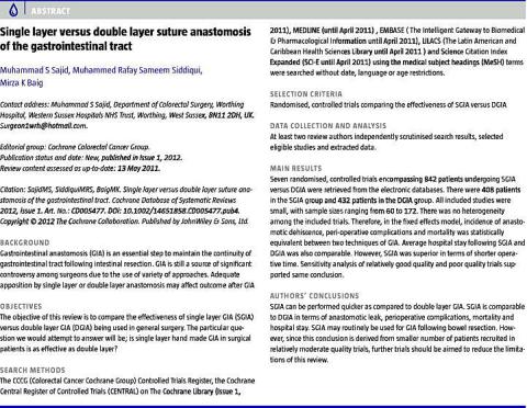 <li>Sajid MS, Siddiqui MRS, Baig MK. Single layer versus double layer suture anastomosis of the gastrointestinal tract. Cochrane Database of Systematic Reviews 2012;(1).CD005477.</li>
