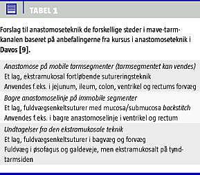 I Danmark adskiller vi os betydeligt fra resten af Europa, idet man i de fleste lande er gået over til at sy tarmenderne sammen i et enkelt lag i stedet for i to lag. Denne udvikling har været faciliteret af en international kursusaktivitet i Davos, Schweiz, hvor man hvert år i de seneste 29 år har afholdt et intensivt kursus i anastomoseteknik netop med indlæring af den etlagede metode til syning af tarmanastomoser [9]. Anbefalingerne fra Davoskurset til anastomoseteknik ses i Tabel 1 . Vi har i Danmark været mere tilbageholdende end i andre lande med at tage denne teknik op i daglig klinisk praksis. Det er således kun på få afdelinger herhjemme, at man i en årrække har anvendt den etlagede metode rutinemæssigt. Det er dog vores indtryk, at der flere steder begynder at komme ændringer, hvor de yngre går over til den etlagede teknik, og på flere afdelinger anvender man nu en blanding af etlaget og tolaget teknik afhængigt af operatørens præference.
