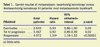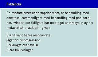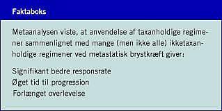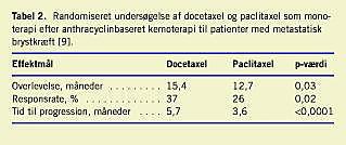 I nærværende metaanalyse skelnes der kun i en subgruppeanalyse mellem, hvilket taxan, der anvendes. Analysen viser ingen signifikant forskel i overlevelse, når paclitaxelholdige regimener sammenlignes med ikketaxanholdige regimener, mens der findes signifikant længere overlevelse, når regimenerne indeholder docetaxel. På grund af heterogenitet er resultaterne svære at tolke. Paclitaxel og docetaxel har samme cellulære angrebspunkt, idet begge stoffer bindes til og stabiliserer de mikrotubuli, der dannes i forbindelse med celledeling. Prækliniske data tyder dog på, at de to taxaner har forskellig effekt, idet docetaxel synes at være mest effektivt. I et netop publiceret studie sammenlignes de to taxaner [9]. I alt 449 patienter, der tidligere havde modtaget anthracyclinbaseret kemoterapi, blev randomiseret til docetaxel eller paclitaxel hver tredje uge. Patienter, der modtog docetaxel, havde en signifikant bedre responsrate (37% versus 26%; p = 0,02), signifikant længere tid til progression (5,7 måneder versus 3,6 måneder; p< 0,0001) og signifikant forlænget overlevelse (15,4 måneder versus 12,7 måneder; HR 1,41; 95% KI 1,15-1,73; p = 0,03) (Tabel 2 ) end patienter, der modtog paditaxel. Såvel hæmatologiske som ikkehæmatologiske bivirkninger var hyppigere blandt patienter, der modtog docetaxel end hos patienter, der modtog paclitaxel, mens der ikke fandtes signifikant forskel i livskvaliteten. Der er i dette studie anvendt docetaxel 100 mg/m2 . Nyligt publicerede data, der sammenligner forskellige doser af docetaxel, viser, at man ved brug af 75 mg/m2 opnår samme overlevelse og tid til progression som ved 100 mg/m2 , men lavere responsrate blandt intention to treat -populationen [10].