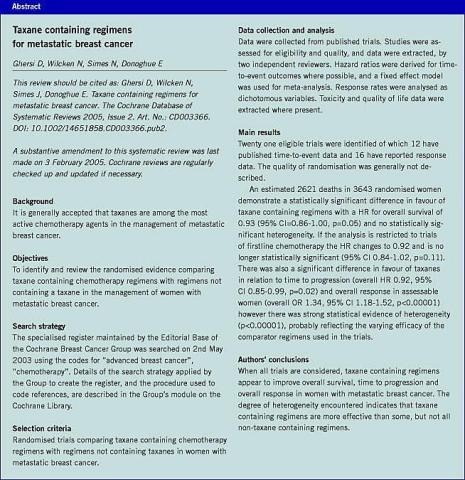 <li>Ghersir D, Wilcken N, Simes J et al. Taxane containing regimens for meta-static breast cancer. The Cochrane Database of Systemic Reviews 2005, Issue 2. Art. No.: CD003366.pub2. DOU: 10.1002/14651856.CD003366. pub2.</li>
