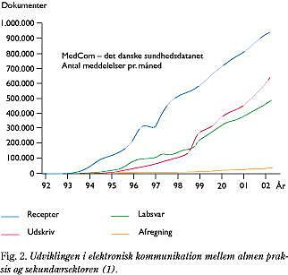 Siden 1994 er antallet af elektroniske epikriser, lægebreve, henvisninger og recepter steget fra 0 til over 2 mio. per måned (Fig. 2 ).