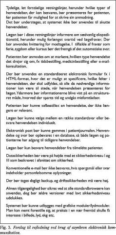 På basis af den internationale litteratur (19), MedCom's »Den gode e-mail konsultation« (20) og egne erfaringer har vi på det foreliggende grundlag i Fig. 3 opstillet en liste med gode råd ved brug af sikker e-mail-kommunikation, der dog forudsætter en juridisk og honorarmæssig afklaring.