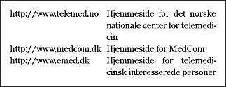 <li>Telemedicin. Redegørelse vedrørende anvendelse af telemedicinske løsninger i det danske sundhedsvæsen. København: Sundhedsministeriet, 2001.</li>