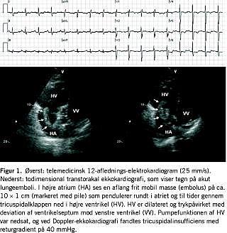 Telemedicin anvendt til præhospital diagnostik og visitation af patienter med ST-elevations-myokardieinfarkt (STEMI) reducerer markant tiden til adækvat behandling [1]. Desuden reduceres dødeligheden ved tidlig behandling med trombocythæmning og perkutan koronarintervention [2]. Den telemedicinske præhospitale diagnostik foretages på baggrund af et 12-aflednings- elektrokardiogram (EKG-12) transmitteret fra ambulancen til det telemedicinske center. I det tidligere benævnte Århus Amt interviewer den telemedicinske læge desuden patienten for at øge den diagnostiske sikkerhed [3]. Hurtig diagnostik og behandling er relevant for andre patienter end STEMI-patienter. I denne sygehistorie beskrives telemedicin anvendt til præhospital diagnostik og visitation af en patient med akut lungeemboli. Venøs tromboembolisk sygdom er hyppigt forekommende med en årlig incidens på en pr. 1.000 indbyggere [4]. Mortaliteten ved akut submassiv og massiv lungeemboli er høj, men nedsættes markant ved hurtig diagnostik og behandling [4].