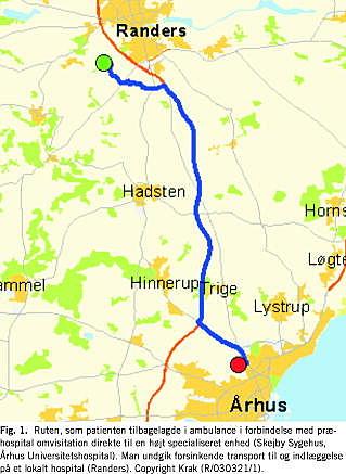 Den 15. juli 2002 kl. 10.10 fik patienten kraftige brystsmerter og tilkaldte hjælp efter 10-15 min. En ambulancelæge ankom til patienten kl. 10.35 og en Falck-ambulance ankom kl. 10.37. En ambulancebehandler optog 12-aflednings-ekg kl. 10.41. Patienten blev klargjort til transport, og ambulancen afgik fra patientens adresse kl. 10.50, samtidig med at et ekg blev sendt til Skejby Sygehus via GSM-nettet. En læge på Skejby Sygehus modtog ekg'et kl. 10.51, konstaterede at patienten havde inferiort ST-elevations-myokardieinfarkt og ringede til ambulancen. I stedet for at indlægge patienten på det lokale hospital (transportvej 7 km) besluttes det at omvisitere patienten direkte til Skejby Sygehus (transportvej 36 km) (Fig. 1 ) under ledsagelse af ambulancelægen. Under transporten blev der givet magnyl, morfika, nitroglycerin og atropin pga. bradykardi ned til omkring 30/min. Patienten ankom til Skejby Sygehus kl. 11.15, og klokken 11.24 var der foretaget kranspulsåreundersøgelse, hvor højre kranspulsåre fandtes okkluderet. Der blev foretaget primær PCI, og kl. 11.28 var der normalt flow i kranspulsåren. Sammenlagt gik der 51 min fra ambulancen ankom til patienten, til kranspulsåren var åbnet. Ekg'et blev normaliseret umiddelbart, og der var kun en beskeden stigning i hjerteenzymerne med plasma-kreatinkinase-isoenzym-MB = 12,2 μ g/l (normalt niveau er under 10,0 μ g/l) og troponin-T = 0,71 μ g/l (normalt niveau under 0,10 μ g/l). En ekkokardiografiundersøgelse viste bevaret hjertepumpefunktion. Patienten gennemgik en ukompliceret bypassoperation den 22. juli 2002.