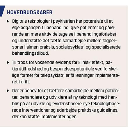 Telepsykiatri kan bane vej for nye måder til organisering af den psykiatriske behandling, herunder fokus på tidlig intervention, færre fysiske fremmøder og mindre tidsforbrug for behandlerne. Feltet er under udvikling, og der er brug for faglig stillingtagen til, hvilken plads telepsykiatri skal have i det etablerede behandlingstilbud, og hvordan teknologien bedst integreres i de eksisterende indsatser i psykiatrien. Der findes endnu ingen nationale retningslinjer for, hvordan digitale teknologier anvendes bedst i det daglige kliniske arbejde. Dansk Psykologforening udgav i 2016 retningslinjer for teknologiunderstøttede psykologydelser, og Psykiatrien i Region Syddanmark har udarbejdet en lokal retningslinje for brug af videokonsultationer [30]. Endelig er der brug for mere viden om, hvordan mennesker med psykisk sygdom anvender teknologi og i fremtiden vil kunne bruge teknologi til at håndtere psykiske udfordringer.