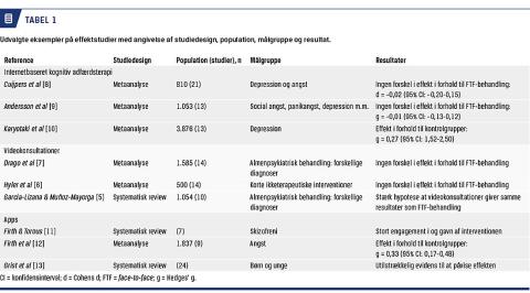 Internetbaseret kognitiv adfærdsterapi er en terapiform, hvor patienterne arbejder med deres psykiske udfordringer i et internetbaseret selvhjælpsprogram med eller uden støtte fra en psykolog. Systematiske review og metaanalyser af effekten af internetbaseret terapi med psykologstøtte sammenlignet med behandling ved fysisk fremmøde viser, at der ikke er forskel på effekt [8-10] (Tabel 1). Meget tyder på, at resultaterne af internetbaseret terapi også kan opnås i en almindelig behandlingskontekst [14], og at indsatser er omkostningseffektive [15]. Kvaliteten af studierne på området er dog svingende, og der er fortsat behov for studier af høj metodisk kvalitet. Der er randomiserede kliniske effektstudier, hvor man har påvist effekt af teknologibaseret forebyggelse af psykisk sygdom og fremme af mental sundhed via internet- og mobilbaserede indsatser hos både voksne [16] og børn og unge [17]. Til trods for en voksende evidensbase for effekt ved anvendelse af internetbaseret terapi er implementering i den kliniske praksis sparsom, og der er kun få eksempler på internetbaseret terapi i drift [18]. I Danmark findes der på området en række digitale tjenester, der er udbudt af private aktører, og en lang række forskningsprojekter [19]. Internetpsykiatrien i Psykiatrien i Region