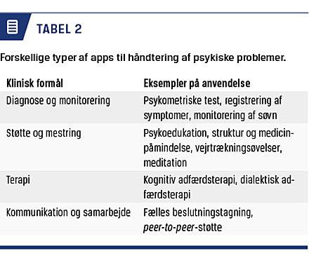 internetbaseret terapi og apps, og der gives et indblik i det eksisterende evidensgrundlag og de teknologiske løsninger, der er implementeret i drift i regionerne. Igangværende forskning på området og pilotafprøvninger er således ikke beskrevet. Hensigten med artiklen er at styrke videndeling om fordele og ulemper ved brug af teknologi i psykiatrien.