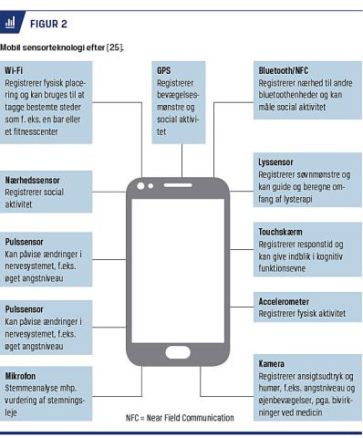 Antallet af sundhedsapps er i vækst, og mange er målrettet mennesker med psykiske sygdomme som depression, angst, posttraumatisk stressreaktion og skizofreni. Der findes forskellige typer apps til håndtering af psykisk sygdom (Tabel 2), hvoraf nogle anvender mobiltelefonens indbyggede sensorteknologi til at opsamle objektive data om patientens adfærd. Effektstudier på området er få og ofte præget af ringe metodisk stringens. Inden for de seneste år er der dog kommet voksende dokumentation for effekt af apps til patienter med skizofreni [11, 20], depression og angst [12, 21] samt til børn og unge med psykisk sygdom [13, 22]. Der arbejdes flere steder i landet med forskning i og pilotafprøvninger af apps til psykiatrisk støtte og behandling. Der bruges apps i de enkelte klinikker, men der er ikke et samlet overblik over, hvilke apps der bruges, eller en systematisk og central implementering af apps. I Psykiatrien i Region Midtjylland har man på Aarhus Universitetshospital, Risskov, implementeret appen Recovery Record til behandling af børn og voksne med spiseforstyrrelser. Psykiatrien i Region Syddanmark er i færd med at implementere Monsenso til digital monitorering ved borderlinepersonlighedsforstyrrelse, skizofreni, angst, depression og bipolar lidelse. Denne indsats er et eksempel på anvendelse af mobiltelefonens sensorteknologi til opsamling af data til målrettede forebyggelses- og behandlingsindsatser [23, 24] (Figur 2). I systemet kan patienterne selv registrere f.eks. stemningsleje, irritabilitet og søvn. Samtidig registreres data om brugerens sociale aktiviteter, f.eks. opkald og fysisk aktivitet. Systemet giver patient og behandler et visuelt overblik over data og forslag til selvhjælp ud fra individuelt identificerede advarselssignaler og mulighed for at intervenere ved tegn på forværring. Systemet er oprindeligt udviklet til patienter med bipolar lidelse [26].