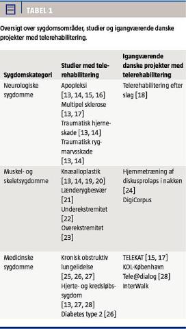phone med tredimensionalt accelerometer kombineret med en terapeutkontakt via en webportal viste god komplians, men ingen forskel i helbredsstatus eller fysisk aktivitet sammenlignet med de sædvanlige tilbud [25]. Et lille norsk pilotstudie med to års opfølgning viste derimod signifikant reduktion i hospitalsindlæggelser og høj grad af patienttilfredshed og komplians med gangbånd, iltmåler og webbaseret træningsdagbog kombineret med en ugentlig videokonference med en fysioterapeut [26]. Dette studie opgraderes i 2014 til et multicenter-RCT mellem Norge, Australien og Danmark under navnet iTrain og foregår i et samarbejde mellem Esbjerg Kommune, Sydvestjysk Sygehus og Aalborg Universitet.
