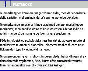 Summary The role of telomeres in aging-related disease Ugeskr Læger 2010;172(40):2752-2755 Telomeres are specialized DNA structures, protecting the ends of linear chromosomes. The association between telomeres and cellular aging is well-established, and it has been shown that there is a negative correlation between telomere length and chronological age for many types of human tissue. On the other hand, the association between telomere length and mortality is poor. Nevertheless, it has been suggested that telomeres may play a role in the development of many aging-related diseases. This has led to attempts to develop telomere-elongating treatment.