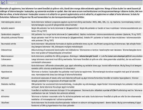 Da man som nævnt mener, at telomerer kan bidrage til den biologiske aldringsproces, er der også i en række studier set på den eventuelle association -mellem telomerer og specifikke, aldersrelaterede sygdomme (Figur 2 ). Teoretisk kunne en sådan association fremkomme på tre forskellige måder: 1) Konstitutionelt korte telomerer: Hvis man er født med meget korte telomerer, vil cellerne hurtigere løbe tør for telomerer, og dermed vil aktivt prolifererende organer hurtigere miste evnen til at forny sig ved celledeling. 2) Øget celleproliferation: Hvis man pga. en sygdomstilstand har et øget træk på en bestemt celletype, vil det afficerede organ efterhånden blive depleteret for de relevante stamceller. 3) Cellulært stress: Hvis telomererne udsættes for cellulær stress, og/eller hvis man er dårlig til at reparere DNA-skader, vil der opstå celler med enkelte kortere telomerer, som via den videre nedslidning hurtigt bliver kritisk korte.