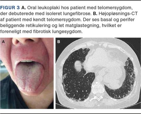 Som nævnt kan der ved telomersygdomme ses en triade af oral leukoplaki, poikiloderma (atrofisk hud med retikulær hypo- og hyperpigmentering og teleangiektasier) samt negledystrofi (Figur 3). Oral leukoplaki eller kroniske mundhuleulcerationer er prædisponerende for planocellulært karcinom. Patienterne kan udvikle andre tegn på kronisk solskade i huden i form af aktiniske keratoser, som kan progrediere til planocellulært karcinom [4, 17-19].