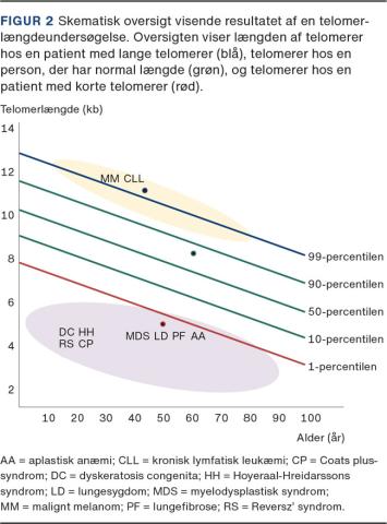 Telomersygdomme forårsages af en ændring af telomerasen, shelterinkomplekset eller de øvrige proteinkomplekser, som medvirker til opretholdelsen af telomerernes funktion. Hvis disse ikke fungerer optimalt, vil telomererne afkortes hurtigere, hvilket påvirker cellernes funktion og evne til replikation. Det kan teknisk være vanskeligt at bestemme den præcise telomerlængde, men i løbet af de seneste 10‒15 år er der udviklet standardiserede metoder, hvor man har fastlagt en øvre og nedre grænse for telomerlængden i forskellige celletyper og relateret til alder [3] (Figur 2). Det betyder, at man nu kan undersøge patienter, som man har mistanke om har en telomersygdom, og dermed kan telomerlængdemåling integreres i både forskning og klinik. Undersøgelse af telomerlængde til klinisk brug foretages aktuelt ikke i Danmark, men kan udføres på udenlandske laboratorier. Hos størstedelen af patienter med en klinisk telomersygdom er det også muligt at påvise en patogen variant i et gen, der koder for de enzymer/proteiner (Tabel 1), der indgår i opretholdelse af telomerernes funktion, hvorfor genetiske analyser med fordel kan integreres i den diagnostiske udredning.