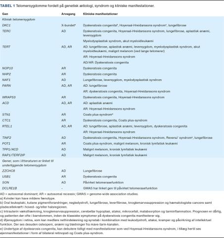 Telomersygdomme omfatter en gruppe arvelige sygdomme, der alle er karakteriseret ved en påvirkning af telomerernes længde og funktion. Tilstandene kan i nogle, men ikke alle, tilfælde medføre en række alvorlige kliniske manifestationer i flere organsystemer hos både børn og voksne [1]. Traditionelt har man forbundet diagnosen med en svær fænotype hos børn og unge kaldet dyskeratosis congenita (en klinisk triade med retikulær dyspigmentering, oral leukoplaki og negledystrofi) (DC). I dag ved vi dog, at det kliniske spektrum er betydeligt bredere, og at telomersygdomme i nogle familier »kun« viser sig med isolerede tilfælde af f.eks. lungefibrose i voksenalderen. Samtidig har vi fået kendskab til en række gener, der har betydning for telomerlængden. Således kan man i dag tilbyde genetisk udredning af patienterne og deres slægtninge samt kontrolprogram til asymptomatiske slægtninge med samme genvariant. Omfanget af patientgruppen kendes ikke, men det skønnes, at der findes 50-100 familier i Danmark med en telomersygdom. Det forventes, at der i fremtiden vil blive påvist telomersygdom hos flere patienter i takt med øget opmærksomhed på den varierende kliniske fænotype samt den lettere adgang til genetiske analyser.