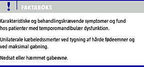 Summary Temporomandibular dysfunction causes orofacial pain Ugeskr Læger 2010;172(44):3037-3039 Temporomandibular disorders (TMD) are the most common cause of chronic orofacial pain. They are characterized by painful and hampered jaw function. Especially disc displacements, osteoarthritis of the temporomandibular joint and masticatory muscle problems are frequent. The pain is localized in the jaws, face and temples, and jaw opening may be reduced, asymmetrical or irregular with noises from the temporomandibular joints. In cases with restricted jaw mobility or when the pain is provoked or aggravated by jaw function, referral to odontological examination is indicated. The prognosis is good, but full recovery may take years.
