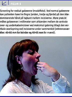 Kæbeleddet er et lille led med mulighed for både rotation og translation og tæt relation til mellemøret. Ledhovedet (kondylen) er valseformet og adskilt fra ledskålen (fossa temporalis) ved en tynd diskus med en perifer voldformet fortykkelse. Normalt glider diskus fremad sammen med kondylen på den kranielle ledflade under gabebevægelser, mens der foregår rotation mellem ledhoved og diskus. Den maksimale gabeevne hos voksne ligger normalt mellem 40 og 65 mm målt i incisivregionen. Gabeevnen er nedsat, hvis patienten ikke kan have tre fingre på højkant mellem incisiverne (Figur 1 ) [14], og reduktionen er kritisk, hvis der er plads til mindre end to fingre [15].