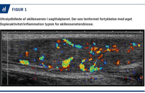 to tredjedele) end patologi ved tilhæftningen på calcaneus. Der er klassisk smertetriade, og senen findes øm og ofte synligt fortykket. Ved UL-skanning ses især hypoekkogenicitet, øget flow og fortykkelse af senen, som alle korrelerer med smerter [3] (Figur 1). Behandlingen er primært aflastning fra hop og løb og stimulerende styrketræning [9, 25] og strækøvelser [7]. Ved entesopatierne beskrives i reglen dårligere effekt af styrketræning, men hvis man undlader smertevoldende belastninger med anklen i dorsalflekteret stilling, opnås der ligeværdig effekt [7]. I en dansk reumatologisk speciallægepraksis var det dog kun ca. 25%, som opnåede et tilfredsstillende resultat ved aflastning og træning alene [7]. Supplement med 1-2 KS-injektioner eller HVI kan forsøges [7, 14]. ESWT kan også forsøges [19], inden man overvejer operation, som er sidste udvej ved utilfredsstillende effekt af konservativ behandling. Operation foretages hyppigst ved entesopati [8].